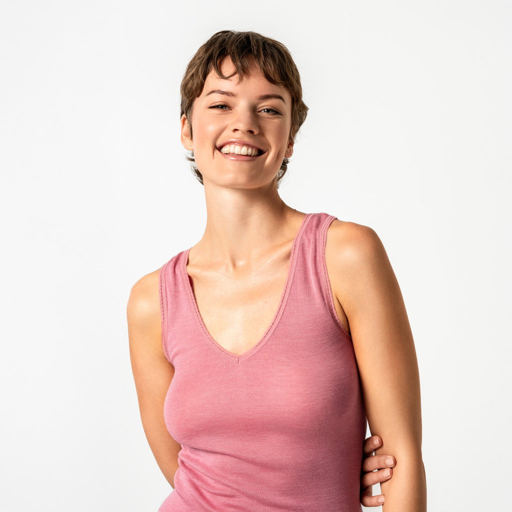 Et linne i 70% ekologisk ull och 30% siden. En tunn och smidig utan sidosömmar. Linnet har en kroppsnära passform och rund hals. Finns i färgen rosa